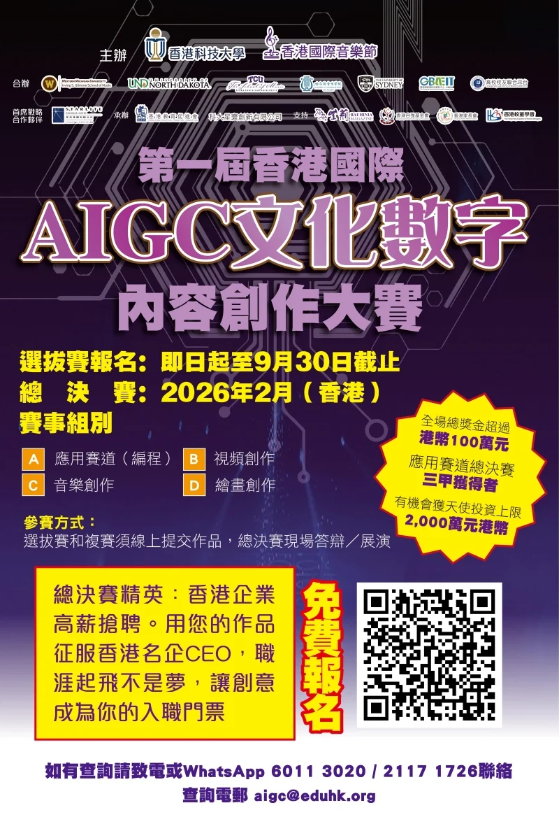 習近平總書記在中共中央政治局集體學習時強調,人工智能是引領這一輪科技革命和產業變革的戰略性技術,具有溢出帶動性很強的「頭雁」效應。為加強人才隊伍建設,以更大的決心、更有力的措施,打造多種形式的高層次人才培養平臺,加強後備人才培養力度,為科技和產業發展提供更加充分的人才支撐。因此,「香港國際音樂節」決定與「香港科技大學」聯合主辦「香港國際 AIGC 文化數字內容創作大賽」,本次大賽不僅是對 AIGC(人工智能生成內容)技術的探索,更是促進世界各國人民深入了解中華文化的堅實平臺。AIGC 技術利用人工智能算法自動生成內容,包括編程、代碼、音樂、視頻、繪畫等,能夠幫助創作者在短時間內激發靈感,提高創作效率,並探索新的藝術表達方式。本次賽事不僅可以搭建一個文化交流共同進步的平臺,更有利於推動我國新一代人工智能健康發展,為國家文化教育事業增光添彩,更好造福世界各國人民。