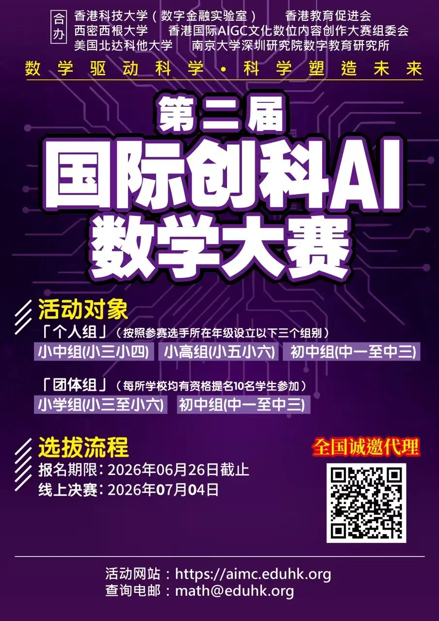 國際創科AI數學大賽2026是由香港科技大學數字金融實驗室、香港教育促進會、粵港澳教育科技創新中心、香港國際 AIGC 文化數字內容創作大賽組委會、美國北達科他大學、南京大學深圳研究院數字教育研究所聯合主辦的數學賽事,以“推動創科融合”爲核心,聚焦數學與人工智能(AI)的交叉領域,激發青少年運用數學思維探索科技前沿問題的潛能。賽事旨在全國範圍內發掘具有傑出數學素養、創新意識及AI應用能力的優秀學子,併爲獲獎者提供以香港爲基地的國際化競技舞臺與交流機會,助力其拓展視野、提升綜合能力。同時,活動也將匯聚學術與產業專家,促進數學與人工智能領域的產學研協作與資源共享,推動科創教育生態的持續發展。 決賽階段將於香港舉行,依託香港國際化背景,爲選手打造一個融合競技、交流與合作的高端舞臺。此外,賽事還將邀請學術界與產業界專家參與評審及指導,促進產學研深度融合,推動數學與人工智能領域的良性互動與長遠發展。 這一賽事不僅強調競爭與選拔,更重視創造力的激發和跨學科思維的培養,是面向未來科技人才的一項重要平臺。